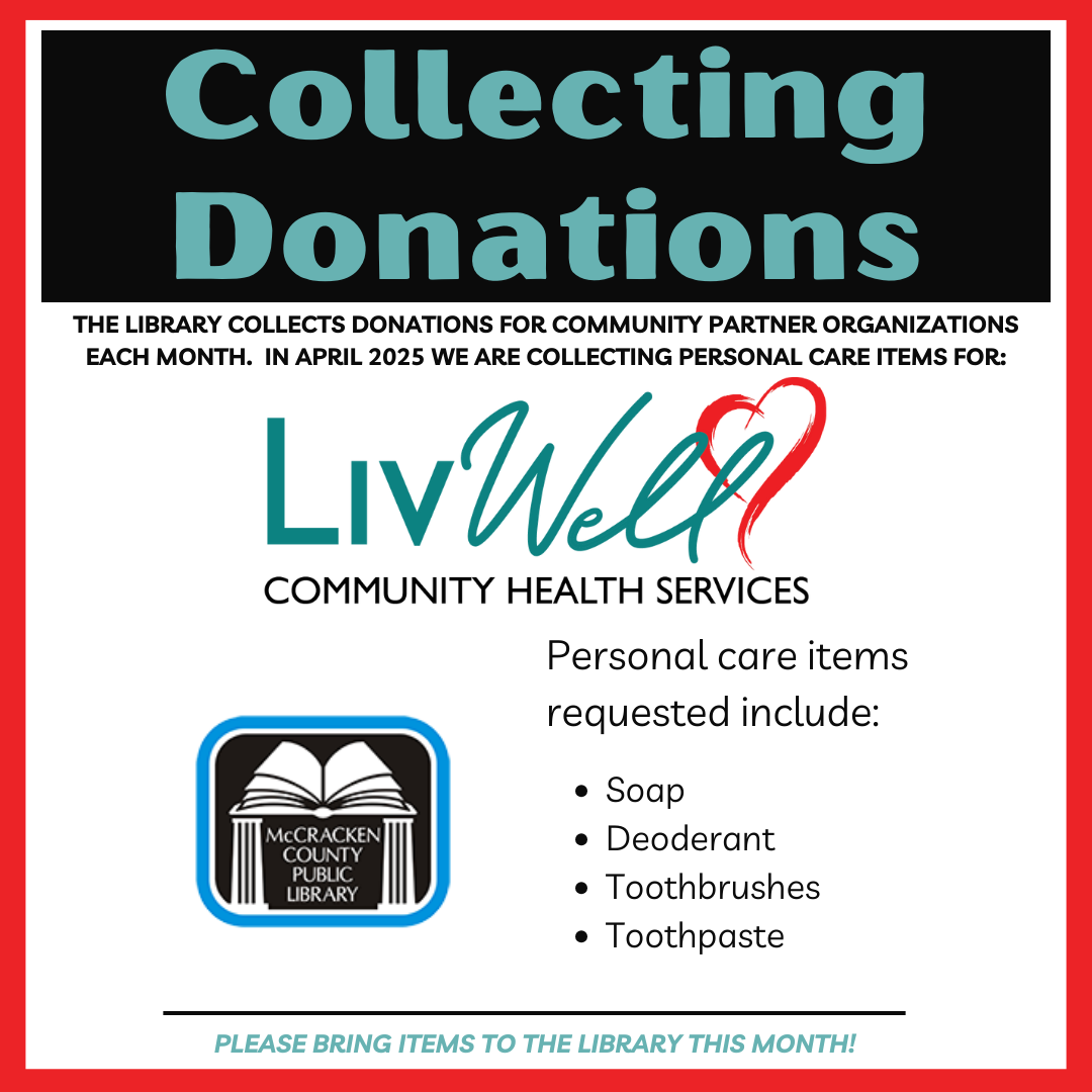 Each month, the Library will collect items for an organization. If you have an annual need (you always collect socks in the fall, school supplies in June, etc), let us know and we'll try to meet your request.