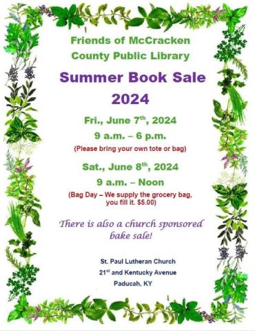 Friends of the Library BOOK SALE Friday, June 7 (9am~6pm) and Saturday, June 8 (9am~Noon) at St Paul Lutheran Church - Paducah, KY. Follow the Friends of Mccracken County Library on Facebook! We'll be sharing Behind the Scenes photos, and helpful Info to make the Sale a success for both our shoppers and McCracken County Public Library. Please share this event with family & friends! 📖