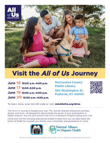 This event is in the "Adults" group This event is in the "All Ages" group Resource Fair Tuesday, January 20, 2026 at 4:00pm - 6:00pm Meeting Room at McCracken County Public Library Program Type: Community Event, Health & Wellbeing Age Group: Adults, All Ages Come to the library to find out about resources for housing, food, employment and wellbeing in our community. View Details This event is in the "Adults" group This event is in the "All Ages" group Jan 20 2026 Tue Resource Fair 4:00pm–6:00pm Community Event, Health & Wellbeing Library Branch: McCracken County Public Library Room: Meeting Room Age Group: Adults, All Ages Program Type: Community Event, Health & Wellbeing Event Details: Come to the library to find out about resources for housing, food, employment and wellbeing in our community.