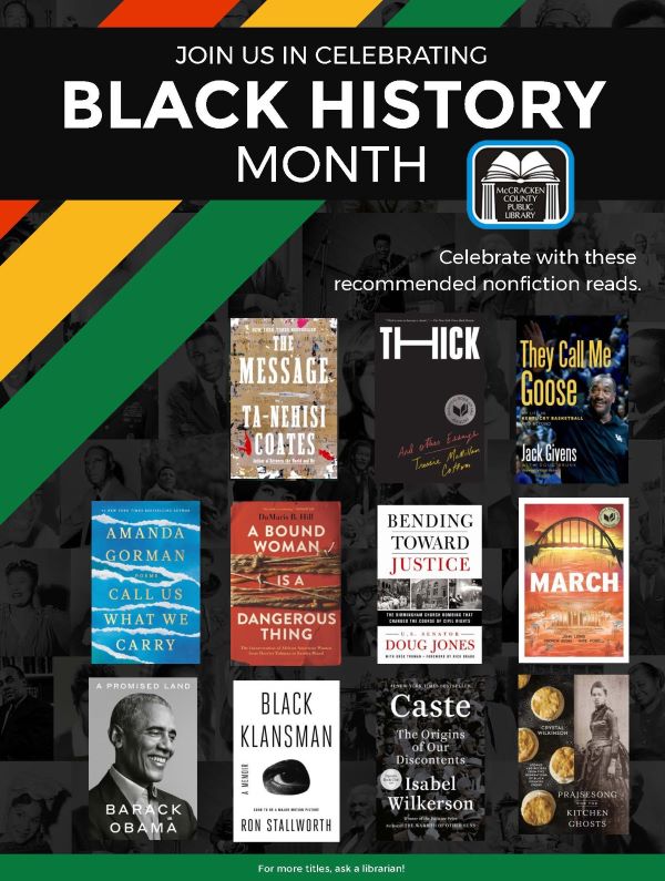 Celebrate with us! Check out our recommended reads and views for Black History Month below and join us February 13th for a program in partnership with the Hotel Metropolitan. This program will be at the Library on Thursday February 13th at 5:30 pm. We hope to see you there! The Program Songbird of the South will tell the story about the life of Rhythm and Blues singer Mary Ann Fisher. This one-woman performance experience chronicles Fisher's life from her tragic and traumatic childhood beginning in Henderson, Kentucky.