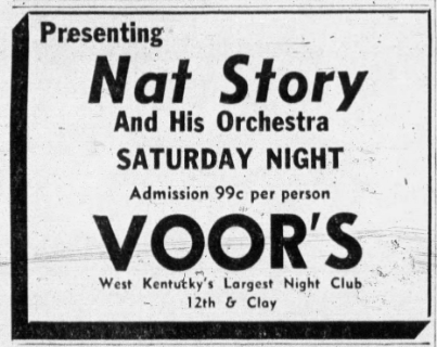 During this time Story continued to play multiple nights a week with his own ensembles as the Nat Story Orchestra, Nat Story’s Dixieland Band, Nat Story Trio and Nat Story Quintet. They were regulars between Cape Girardeau and Charleston, MO, Paducah and Owensboro, KY, and Evansville, IN. Most notably the band were leaders in the Paducah music scene, performing at places like the Voors, Club 400, Silver Spur, and at private events. They even performed on the back of a truck during the 1956 Paducah Centennial Celebration. His ensemble during this time often included local favorites Joe “Mr Blues” Smith on violin and vocals, along with Jeff Massie on saxophone.16