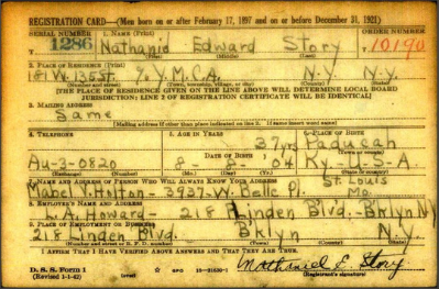 According to the 1940 census, Nat was living on West 110th Street in New York City, near the North woods of Central Park and working as a musician, making around $2,400 a year. But by February 16, 1942, when Story registered for the military, he listed himself as living in a YMCA in Harlem. He served as Army Private First Class in the 47th Qm Trk regiment and was discharged March 15, 1943.8