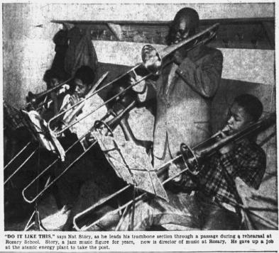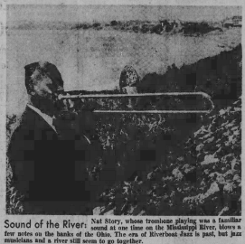 While trained to be a shoe repairman, the job never quite fit. Not long after high school Story was hired by Lincoln High alumni and father of riverboat jazz, Fate Marable. Marable’s mother had influenced Nat's musical training as his piano and band instructor at Lincoln when he was 15. The connection likely helped start Story's career as one of the greatest trombone players of the era. Beginning in 1924, his 5-year tenure on the river would provide him with the opportunity to play with Louis Armstrong, Zutty Singleton, Dewey Jackson, Floyd Campbell and others.2