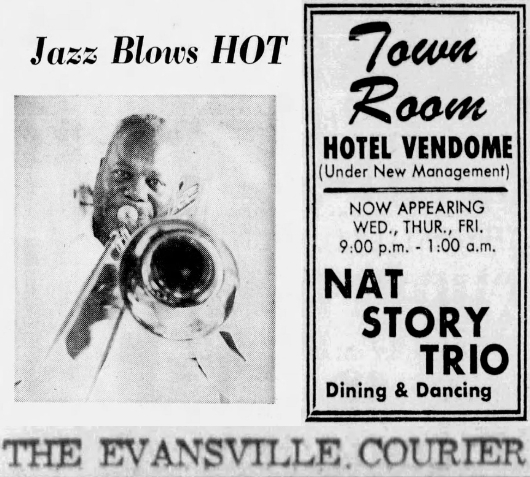 Through the late spring to the early fall of 1968 the Nat Story Trio could be found most Wednesday, Thursday, and Friday nights from 9:00 PM – 1:00 AM at the Hotel Vendome’s Town Room. The trio played jazz and blues, providing the Evansville nightlife with an authentic glimpse into the American songbook.